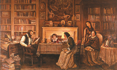 中央美術學院教授孫景波已經74歲,是參與創作的畫家中最年長的。他說:“我們這代人是在馬克思主義的信仰下成長起來的。馬克思主義解放全人類,改造舊世界,建立世界大同的革命理想,是我所信仰和追求的。我年輕時讀馬克思傳記,了解到馬克思為實現推動人類進步孜孜以求的精神和馬克思家庭濃郁的親情人文氛圍。對此有著深厚的情結。因此這次創作,我主動選擇畫馬克思一家人在書房里朗讀莎士比亞詩歌的場景,表現馬克思作為學者、詩人、丈夫、父親的一面?!睂O景波的這幅《革命的一家人》,采用電燈發明之前、燭光的用光,充滿明暗虛實的神秘感和親情的溫馨,襯托出一個書香家庭詩的意境。場景選擇的時間節點是1865年,馬克思、夫人、長女、二女兒和幼女全家相聚的時刻。