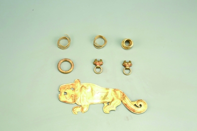 自2017年4月開始,考古隊通過“探方式”的發掘方法對墓地進行了搶救性發掘。截至目前,完成了19座中小型墓葬的清理工作,其中4座遭到盜擾,15座保存完好;共出土銅、金、鐵、石、玉、陶、料珠、漆木等各類材質文物300余件(組),其中的青銅器主要包括青銅禮器、車馬器、兵器三大類,禮器包括食器的鼎、簋、甗,水器的盤、匜及酒器的方壺,車馬器數量最多,共50余件(組),包括常見的馬銜、鑣、鑾鈴、車衡飾、車轄、軎;兵器有戈、矛、甲胄、鏃等。除此之外,還出土了喪葬用器的銅翣,及由銅魚、銅鈴、陶珠(石貝)組成的棺飾件。更讓人稱奇的是,在其中兩座小墓中,考古人員還發現了3件金耳環。