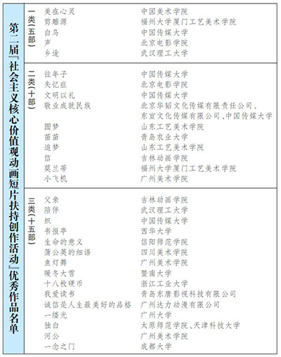 社會主義核心價值觀動畫短片創作扶持活動由原新聞出版廣電總局聯合教育部高等學校動畫、數字媒體專業教學指導委員會于2015年發起,旨在引導高校動畫專業學生等青年動畫人才在學習創作實踐中貫穿結合融入社會主義核心價值觀,不斷推出短小精悍、藝術性強、展示真善美、充滿正能量的優秀動畫作品。