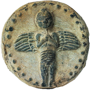 2014年,新疆維吾爾自治區博物館舉辦的《絲路遺珍匯天山——西北五省文物精品展》,就陳列了一件具有異域特色的瓦當。這件瓦當直徑13厘米,由青海省民和回族土族自治縣川口水泥廠出土。瓦當上繪一羽人,圓臉,大鼻子、大眼睛,上身赤裸,梳圓形發髻。羽人雙手合十于胸前,背上有雙翼,周圍以聯珠紋作環狀圍繞。