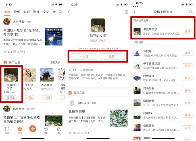 (1)在app發現頁熱門主題欄找到【你我的文學】主題關注。(如圖一)