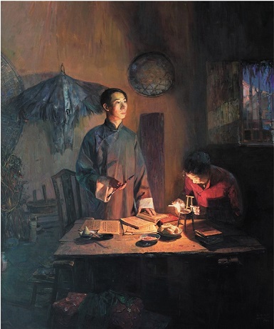在畫面藝術表現上,張峻明采用了現實主義加浪漫主義的表現方式。創作期間,張竣明聽取了中央編譯局、中國美協、中央美院專家的建議,最終確定了陳望道站姿,頭仰望窗外,喻意東方欲曉,母親給他送來粽子,撥動火苗引喻薪火相傳,點亮信仰之火這一構思。畫面構思全部確定之后,就是起稿上畫布階段了,大的色彩關系一直在調整中被確定下來,細節問題逐個推敲解決。比如,陳望道的被子、枕巾等?!耙驗椴穹坷飾l件特別艱苦,白天寫字用的桌子到晚上是睡覺的床,畫面中的細節都要考慮進去?!弊鳛闅v史題材主題性創作,如何將作品歷史性和藝術性相統一,一直是張峻明努力的方向。畫《陳望道翻譯〈共產黨宣言〉》時,張竣明最初選擇在書房,根據查閱大量的史料,他感覺“書房”出現與那時候的真實背景有些不太相符,因此改為了柴房。