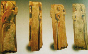 1996年新疆文物考古工作者在民豐縣尼雅遺址中發現的一組四件木雕舞蹈人像