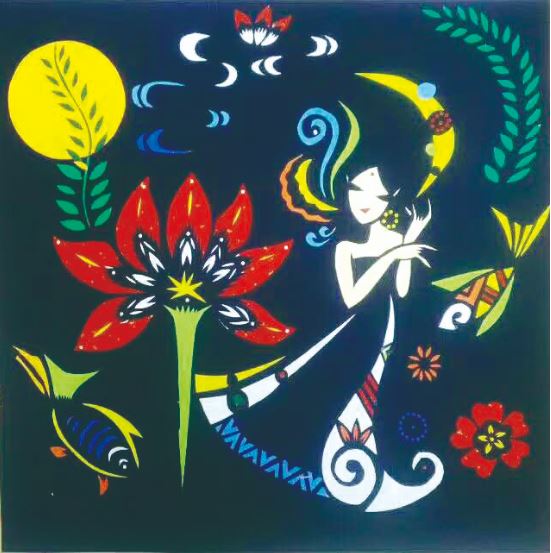 郝明森是將“雅”與“俗”兩個字合二為一的代表。他平時忙于工作,工作之余就“玩”剪刀。他的剪紙作品離不開大巴山區的節日風俗、人生禮儀,他在參加民俗活動中尋找靈感,把眼睛看到的變成剪紙作品——窗上貼的喜慶窗花、門上貼的福字、繡花的原始底樣,那些圖案有山有水,有花有草,有魚有鳥,有的還抽象化以寄托一種信仰或期望?!斑@幅是1993年在學校參加全國剪紙大賽剪的,原作足有15米長?!焙旅魃钢环麨椤栋倥D》的剪紙作品說:“我父親是個養牛專業戶,我長期與牛作伴,就琢磨著如何讓形態各異的牛變成我的剪紙作品,這叫捕捉靈感出作品吧?!?/p>