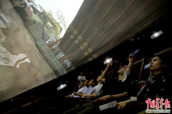 5月18日,故宮博物院《清明上河圖3.0》高科技藝術互動展演現場,觀眾在虹橋球幕影院,“坐”上一條大船,任河水劃過腳下,柳枝拂面,感受汴河的繁忙,兩岸的綺麗。