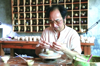 劉坤庭在工作室內制作陶瓷 王驍金龍 攝