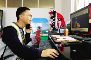 蘇濤設計民族服飾圖案時用手機與同行交流。