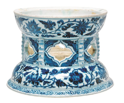 這使我們聯想到另一件元青花瓷器——英國劍橋大學菲茨威廉博物館收藏的一件 “青花纏枝花卉紋鏤空器座”,高28.9厘米、口徑 23.5厘米、底徑27.4厘米,整體圓形,由上、中、下三部分組成?!吧喜砍?,中部束腰,下部外撇,整器上下貫通,中空……上部外壁繪纏枝蓮紋;腰部以凸起的半埋式竹節狀豎棱分割為六面,每根竹節狀豎棱都有七節,在每節上都用青花繪線條,腰部的六個面均有一鏤空的菱花形開光,開光周邊空白處也均用青花紋飾填滿;下部外壁繪纏枝牡丹紋,足墻為一圈卷草紋?!?/p>