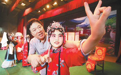 日前,在河北青縣木門店鎮扣莊村“哈哈腔”傳承示范基地,傳承人劉宗發(右二)正為排練中的小演員指點表演動作。