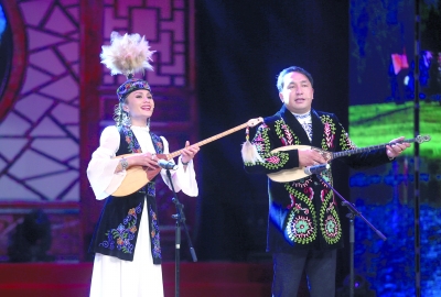 提留哈布·賽爾山別克與丁娜·阿扎提在曲藝周開幕式上表演哈薩克族鐵爾麥《如果這樣有什么用》。