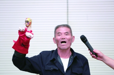 圖為湖南邵陽布袋戲國家級代表性傳承人劉永安在展示他表演中所用的木偶。(圖片由國家圖書館提供)