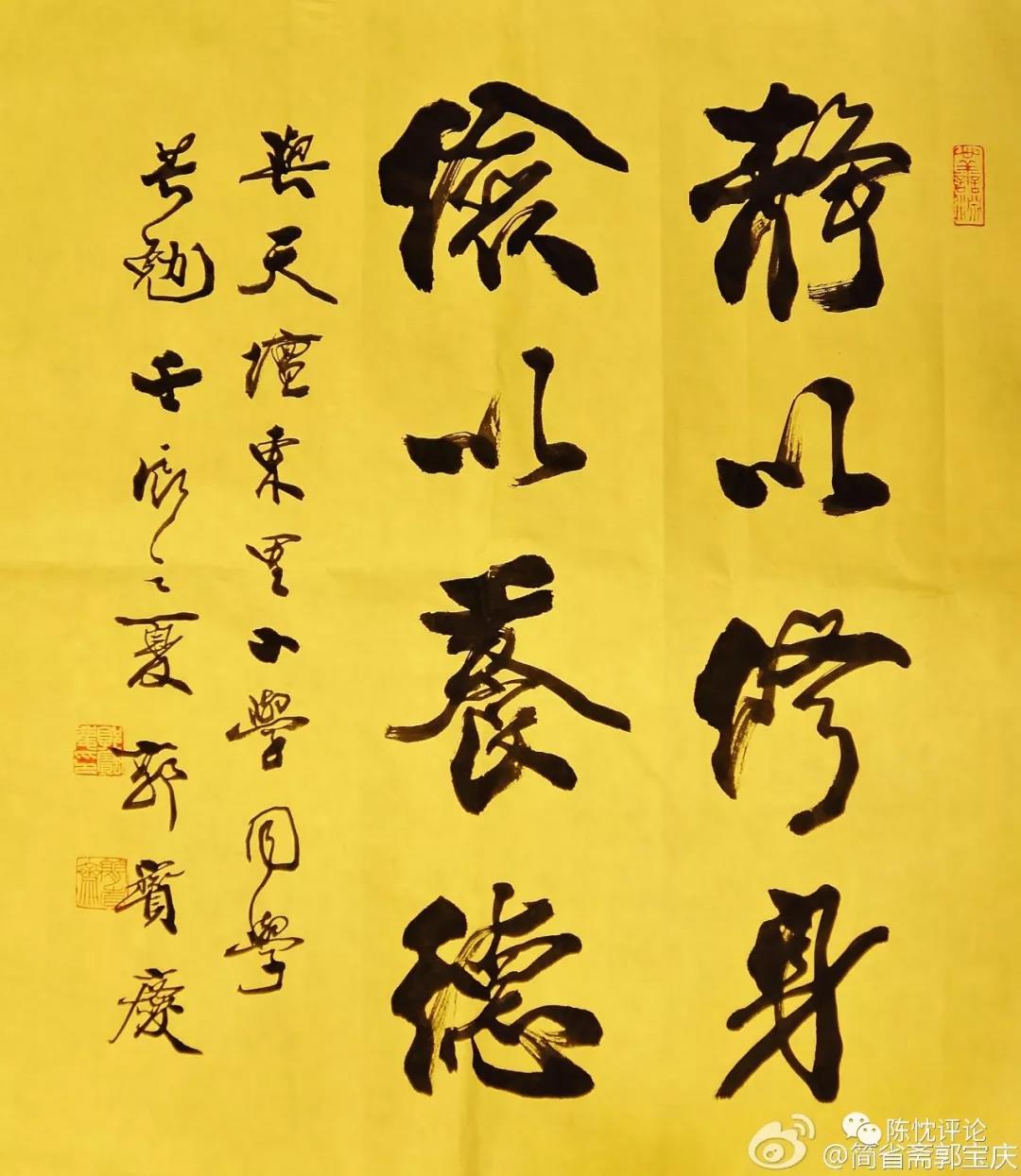 對名利的過度追求,對書畫界的有些事情,他有自己的基于“良知”的判斷,“有些書畫家一見面,就開始滔滔不絕的講,我最近書法又漲了,多少多少錢一尺”!“我是××多少多少代孫”!每次聽到這種話,郭寶慶只是笑著和對方講“能不能好好聊天?這些和你字寫的好與壞有多大關系?來,臨一段顏清臣的《多寶塔碑》和《顏勤禮碑》,沒學會走,就想跑!”