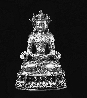除此之外,一尊罕見漢藏宮廷風格“十五世紀 銅鎏金嵌寶 無量壽佛”也吸引眾多藏家關注。無量壽佛是為明清兩代宮廷佛堂供奉的重點內容,此尊無量壽佛面龐方圓,頭戴五葉花冠,頂結高發髻,耳側繒帶翻卷,耳垂圓形花珰。面容莊嚴肅穆,厚唇仍帶朱砂漆,眉心白毫鑲嵌寶石,寶石仍保存完好。本尊裝飾繁縟,工藝精細,體量碩大,銅質細密,雖然不帶刻款,但造型樣式、雕刻水平、鑄造工藝等與宮廷造像基本沒有區別,彰顯出明顯的皇家氣度。大量研究已經表明,明代宮廷造像主要有兩種形式,分別代表兩種不同的用途:一種是刻有紀年銘文的形式,造像上刻有“大明永樂年施”或“大明宣德年施”的款識,主要用于賞賜西藏上層人士;另一種是無紀年銘文的形式,主要為宮廷佛堂或皇家寺廟供奉。此次亮相的這尊“銅鎏金嵌寶 無量壽佛”明代宮廷造像就是此種無紀年銘文的形式,它以完美的造型、精致的工藝充分顯示了它的高貴的出身——宮廷御用監督造。