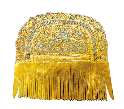 推測為安史之亂時期的伎樂飛天金櫛代表了當時的技藝水平。金櫛是一種頭飾,用薄金片鏤空鏨(zàn)刻而成。這枚金櫛呈馬蹄形,下部呈梳齒狀,櫛面上部滿飾花紋,中心主紋以卷云式蔓草作地,上飾兩個對稱的奏樂飛天,飛天下方飾一朵如意云紋。周邊飾多重紋帶,分別為單相蓮瓣紋帶、雙線夾蓮珠紋帶、鏤空魚鱗紋帶、鏤空纏枝梅花間蝴蝶紋帶等。