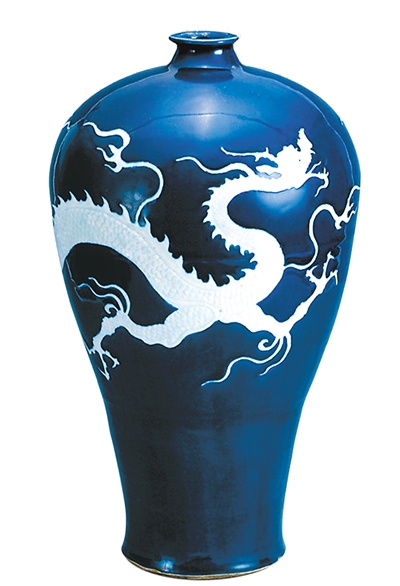 元代的藍釉瓷器傳世十分稀少,目前全世界僅存有12件,而白龍紋飾的梅瓶只有3件,另外兩件分別收藏在巴黎集美博物館和北京頤和園。藏于巴黎的那一件,白龍頭部燒制的時候有黑點,不夠完美,北京的那一件,瓶身有一道明顯的裂痕。而揚州博物館這一件器型最大,也是最完美的一件。