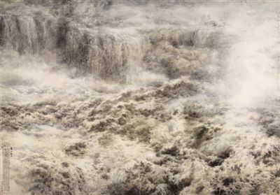 每一個草稿,都是向“完美”逼近的階梯。初稿之一“大塬靜涌遠去”,于2013年9月在中國國家博物館草圖觀摩展中受到充分肯定,但宋雨桂深感還沒有畫出他心中的黃河,于是開始重新思考。第二稿選擇“壺口”為節點,更適于表現“黃河之水天上來”波瀾起伏、洶涌奔騰的氣勢,彰顯其濤聲澎湃、川流不息的精神。這一設計稿于2014年6月完成,雖然同樣在草圖指導工作會上得到好評,但宋雨桂依然在推敲如何更好地表現和處理水勢,以使畫面呈現出一路挾雷裹電咆哮而來經久不衰的黃河氣概。為突出“魂魄”,他再次否定了“深溝翻滾而下”常規的黃河瀑布表現形式。2015年完成的第三稿設計,畫面構圖大膽,摒棄石頭河岸等常規思維,用水的力量支撐黃河之水咆哮而來的氣勢。于是,鏗鏘有力、洶涌而下的黃河瀑布,成為畫面主體。急流忽上忽下、忽左忽右,暗喻畫面里藏著兩岸的山,水底的石托起黃河的驚濤駭浪,掀起萬丈狂瀾。這更能體現黃河博大寬厚、柔中帶剛、勇往直前的精神。