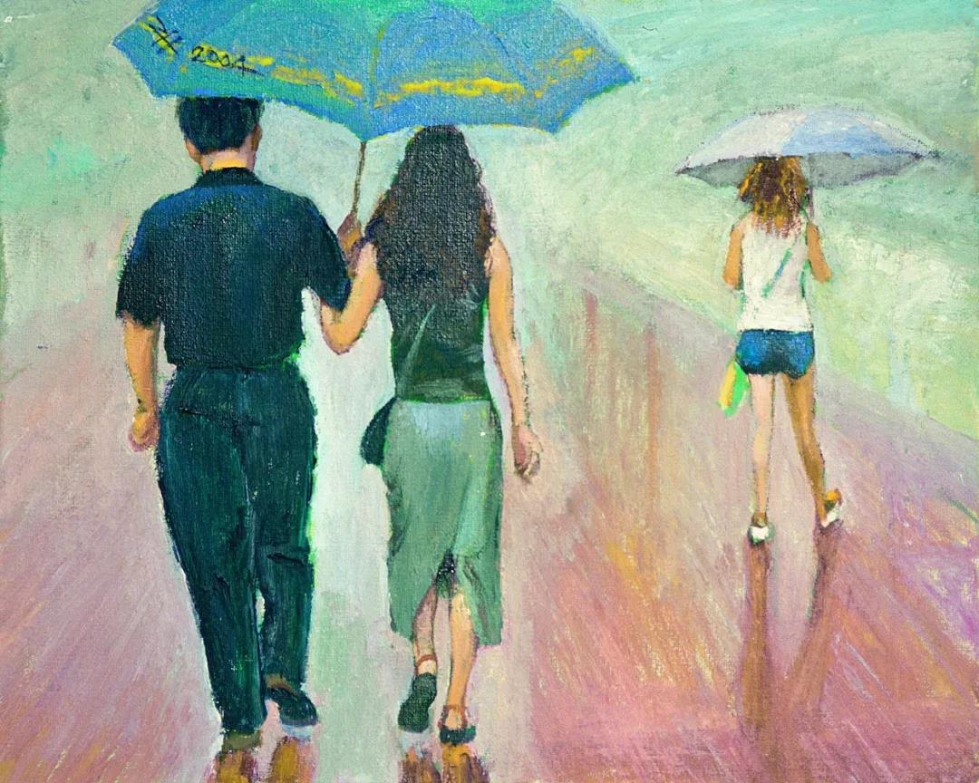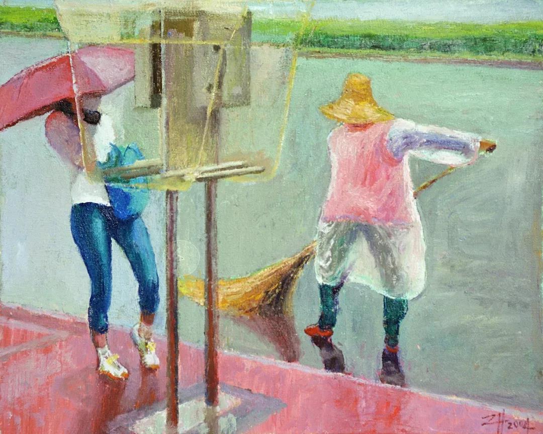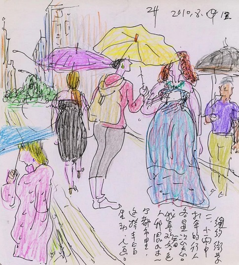 近年每逢夏天,京城的雨多雨大并不亞于南方。我畫了《今夏雨多》系列 ,分別稱作為《大雨》、《中雨》、《小雨》。雨中有共撐一把傘的戀人,有冒雨送孩子上學的母親,還有掃街的環衛女工和電話亭沒完沒了私語的時髦女郎交集在同一雨景中。