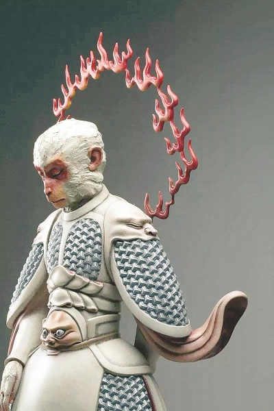 “真與假,考驗的不僅是唐僧與孫悟空師徒間的信任與感情,也是孫悟空自我認知逐步加深的過程?!彼栽诘袼茏髌分?,兩尊美猴王正反雙身立于一線:其身后一面是熊熊火焰,一面是淡然浮云。不但形象和故事是東方的,其傳遞的意蘊也是東方的。過去揮舞在手中的金箍棒被藏在身后,沒有了昔日的機敏與張揚,兩個孫悟空神情內斂,反倒給這個東方英雄賦予更多的沉靜力量。