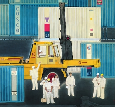 斗轉星移,滄海桑田,改革開放賦予了時代新的活力,不僅影響著城市的面貌、行業的發展,也滲透在每個人的日常生活中。從1978年小崗村的承包契約,到2017年的C919國產大飛機,從老式收音機、翻蓋手機,到網絡圖標、共享單車……40個代表其所屬年代的物象,在作品《四十年的溫度》中以圖譜的方式依次展開,讓觀者直觀感受到改革開放40年間百姓生活所經歷的點滴變化;《時代新象》將各個品牌的快遞車集于一畫,這些與當代人生活息息相關的畫面不僅能有效引起觀眾的共鳴,還為藝術作品增添了幾分接地氣的質樸;《年輕建設者》《同心協力》《地下筑夢者》等作品從不同的方面熱情謳歌了勞動者昂揚的精神風貌;《都市凡人》《小生活》《書香滿城》則以敏銳而獨特的視角,切入普通百姓的日常生活,呈現出充滿溫度的時代圖景。