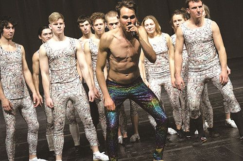 過多的論述性獨白,讓這部作品看起來更像是一篇探討當今網絡時代資本主義個體與群體關系的社會學論文。劇中,波列許以布萊希特關于個體與集體的思考為基點,輻射出了對個體與網絡、個體與媒介關系的現代追問,引出了人們是否還愿意為愛而殉情、網絡時代人的信用何在等話題,甚至還插入了馬克思、???、讓-呂克·南希等人的觀點“以身說法”,以增加作品的理論性和說服力。波列許追求建立在深刻基礎上的批判,但他的講述過程深入淺出、表現手段日常而淺顯,他善于將自己的論點分散在舞臺演出的不同節點上,以流行元素、時尚媒介、視聽沖擊加以偽裝,讓觀眾輕而易舉地進入他的舞臺世界,這正是波列許戲劇創作的高明之處。比如,添加趕時髦樂隊的音樂,以此表現當代人激情的缺失,沒有人愿意再為愛情而赴湯蹈火了;播放邁克爾·杰克遜的演出視頻,以此來諷刺標榜虛偽個性的人,其實就是消解自我的一味模仿;“資本主義合唱團”跳起了《大河之舞》,暗示著流行文化帶來的千篇一律,實際上背后沒有實在的東西;在搖滾歌手莫里西《人生是一個豬圈》的音樂中,舞臺成為旋轉的游樂場,合唱團的成員們在雨中肆意狂歡,毫無底線地放縱著自己,而此時的法茨獨自拉著大篷車,逆時針地艱難前行,這段對“大膽媽媽”的戲仿,表達的既是一種逃離的行為,更是一種堅持個性的生存選擇與態度,只是最終,他失敗了。