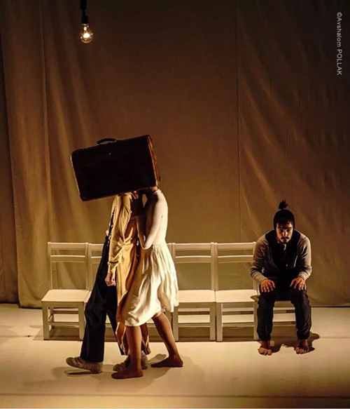 舞臺上那只昏暗的白熾燈下,行將就木的老先生肩扛一只陳舊的皮箱;與面對的三位男舞者,以體姿、神態和裝束顯示出青、中、老年不同的年齡感;一排規整擺放的白色椅子,似是走過的路,靜靜地鋪展在那里。