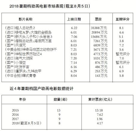 截至8月5日《中國新聞出版廣電報》記者發稿時,共有12部動畫電影登上銀幕,其中8部為國產動畫,數量上基本與去年暑期檔持平。其中,《哆啦A夢:大雄的金銀島》和《超人總動員2》分別以3.54億元和2.09億元票房占據頭兩席,位列第三位的《新大頭兒子和小頭爸爸3》票房為1.57億元。