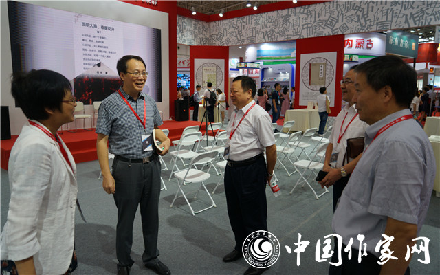 中國作家出版集團管委會副主任鮑堅和湖北省作協黨組書記、副主席朱訓集,湖北省作協副主席耿瑞華等在館內交談