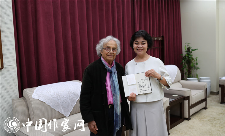 參加國際寫作計劃的敘利亞詩人阿多尼斯向中國作協主席鐵凝贈送了自己的詩集