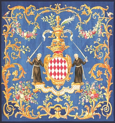 織有摩納哥格里馬爾迪家族的徽記的掛毯(局部),“貴胄綿綿:摩納哥格里馬爾迪王朝展”展品