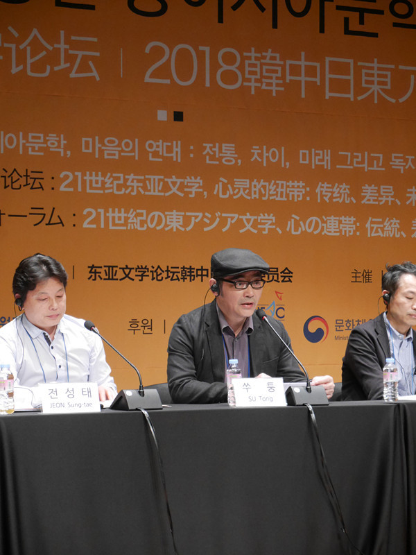 17日下午,中國作家蘇童,韓國作家全成太、金愛爛,日本作家阿部公彥、若松英輔圍繞“傳統”這一話題發表了各自的看法;中國作家張煒、曹有云,韓國作家陳恩英、張康明以及日本作家島田雅彥、小山田浩子等就則“差異”展開交流。