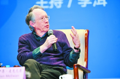 麥克尤恩是一個在倫敦郊外潛心寫作的智慧老頭兒,至今已寫作50年,他對文學未來的暢想,對世界的敏銳觀察,還有對往昔的回憶,令中國同行印象深刻。上周五,他在“21大學生國際文學盛典”領獎、發表致謝詞,并接受了一屋子媒體記者的群訪;前天,他與讀者一起度過了午后時光,他與中國作家格非的對談,將大家帶進了“大眾媒體時代的虛構敘事”世界中。