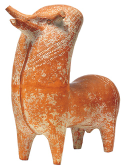展覽現場不難發現很多牛的形象,其中閆志特別介紹了一件伊朗出土的牛形陶器,“這件陶器看起來很‘萌’ ,而且造型帶有強烈的現代感,但它的年代實際上是在公元前1200至800年左右,距今已經有3000年的歷史了。 ”展覽第二部分的展柜里擺放了大大小小不同造型的牛,都是在西亞、伊朗地區出土的,而在展覽第一部分的藏品中也能發現很多牛的形象,比如陶器上牛的紋飾、牛形酒壺等。閆志介紹,瘤牛在古代的西亞、印度、非洲等地區被視為家畜來飼養繁育,而以公牛崇拜為核心的宗教則發源于西亞,并向四周傳播?!芭T谌祟愒缙谖拿髦械淖饔镁薮?,對牛神的崇拜也遍及絲綢之路沿線地區。因此在展現中我們可以看到許多牛的形象,從希臘到兩河流域到伊朗甚至到印度北部。我們把這些牛擺在一起,讓大家看到不同時代、不同地域,人們對牛的崇拜是多么的相似,這也是我們在策展當中的一個思考。 ”