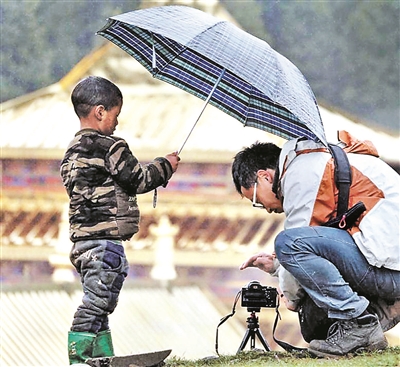 還有一張照片,被我珍藏了很久。那是我在藏區,當時我外出拍攝,遇到了下雨。以我的性格我是不會選擇停工的,雖然沒法進行航拍,但是延時攝影還是要堅持做的。我把我的傘讓給了相機,自己淋雨操作。一個藏族的小孩子看到我當時的樣子,主動幫助我打傘,而他自己的身體倒是有一大半在外面淋著。我的同行伙伴,幫我記錄了這個瞬間。