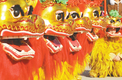 上午10點,伴隨著動感熱烈的鼓點,幾只紅黃相間的獅子歡快登場。在觀眾的注視下,獅子們時而閃轉騰挪,時而騰空躍起,時而頂腰扭動,下山探寶,把那股剛勁威猛勁兒表現得惟妙惟肖。
