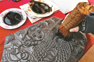 “這個環節看似簡單,但必須把墨均勻的涂開,否則線條不流暢?!眮碜蕴旖蛞患耶嬊f的男主人吳學軍、女主人李月鳳,夫妻二人自幼酷愛繪畫,師承著名國畫家韓祖音先生,他們現場指導游客將雕刻好圖案的木板套印在白紙上,生動的“胖娃娃抱鯉魚”躍然紙上。