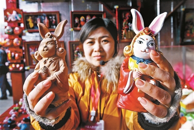 左手舉著小豬佩奇的“新版”北京面塑,右手端上兔爺造型的天津泥塑彩繪,親手磨墨、套印,嘗試制作楊柳青木版年畫,玩累了用河北蔚州的青砂器泡壺茶歇歇腳……京津冀攜手賀新春,游客逛廟會,可把三地的非物質文化遺產精粹“一網打盡”。