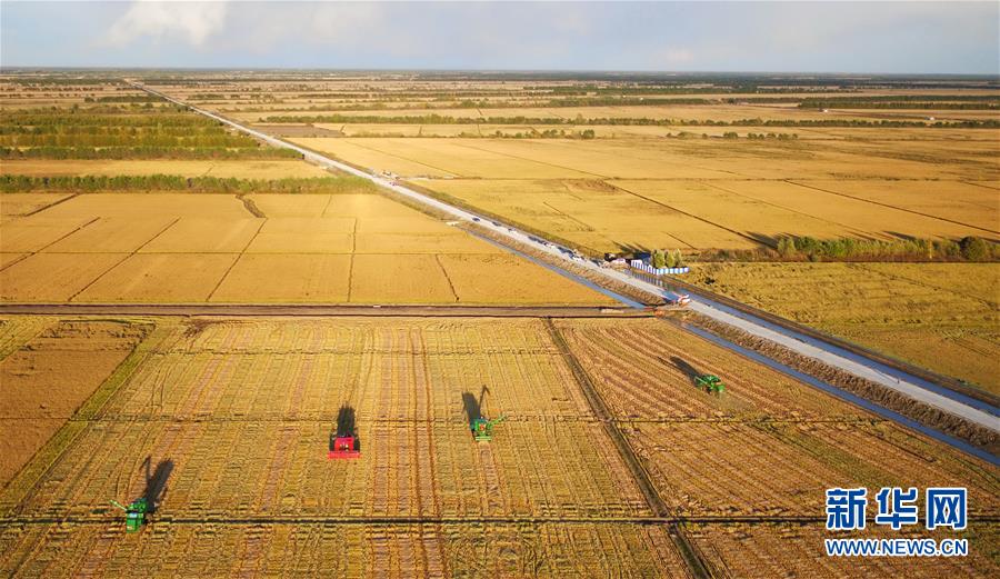 這是大型農機在黑龍江省三江平原一處稻田收割水稻(2017年9月28日無人機拍攝)。 新華社記者 王建威 攝