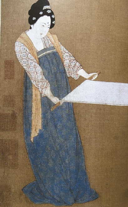 張萱和周昉是唐代仕女畫最重要的代表人物?!缎彤嬜V》稱張萱“于貴公子與閨房之秀最工”,善于描繪曲眉豐頰、“朱暈耳根”的仕女形象。張萱的原作今已無存,史上留下兩件重要的摹本,即傳說是宋徽宗臨摹的《虢國夫人游春圖》卷和《搗練圖》卷。其中《搗練圖》卷現藏于美國波士頓美術博物館,表現的是貴族婦女搗練縫衣的工作場面,按勞動工序分成搗練、織線、熨燙三組。只見宮女們身著低領窄袖短襦,系高腰長裙并扎絲帶,身披輕薄如紗的印繡紋樣披帛,舉止嫻雅,意態從容。