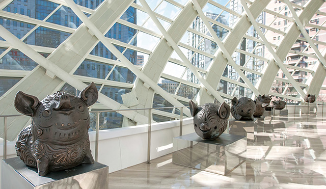 在此次的參展作品中,觀眾既可以看到韓美林在2015年為紀念世界反法西斯戰爭勝利70周年、聯合國成立70周年而特意創作的《和平守望》,也能欣賞到其曾于2008年被大英博物館收藏的青銅雕塑《馬》,還能欣賞到表現人文主義關懷的《母與子》系列、《豬》《熊貓》《熊》《馬》《?!返葎游锵盗?,以及頗具實驗性的《人體》《天書》等十余個系列。其中,韓美林創作的形態各異、憨態可掬的小豬雕塑,曾于今年春節前后在故宮博物院舉辦的“韓美林生肖藝術大展”中亮相,吸引了海內外大量觀眾前來參觀。