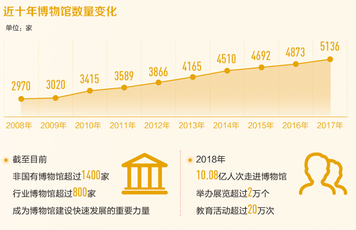 據文化和旅游部統計,2008年至今,我國博物館的數量呈現明顯加速增長之勢。截至2017年底,全國在各級政府備案的博物館達到了5136家,每年新增博物館平均在180家左右。