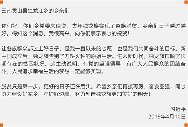 2019年獨龍族整族脫貧,鄉親們一起寫信告訴總書記這個振奮人心的好消息,習近平回信祝賀:“脫貧只是第一步,更好的日子還在后頭?!辈还馐仟汖堊?,習近平在信中還表達了對各民族的熱切關心,“讓各族群眾都過上好日子,是我一直以來的心愿,也是我們共同奮斗的目標?!?/p>