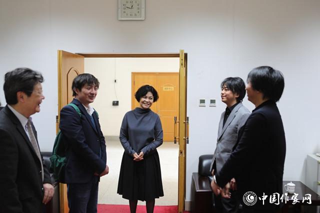 鐵凝(中)、李錦琦(左一)、阿乙(左二)與日本作家中村文則(右二)、上田岳弘(右一)在會議間隙交流