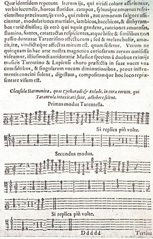 舞蹈和音樂是治療由塔蘭托毒蛛叮咬所致的瘋狂病的唯一有效藥物,但也不是任何的音樂和舞蹈都有效,只有在阿普利亞演奏了數百年的這種傳統音樂曲調才有效,要是沒有這舞蹈和音樂,病人會在幾小時或者幾天內死去。就這樣,他們常常太陽一升起就開始跳,持續不斷地跳到午前十一時。但也有些人會在中途停下,這并非是因為跳得過于疲憊不堪才不得不休息,而是因為發現舞蹈的節拍跟不上曲調。如此這般,大約跳到正午,他們才停息下來,躺到床上去盡情出汗,然后擦干身上的汗,喝點兒肉湯補充營養。大約下午一點,最遲兩點,舞樂又開始了,人們一直跳到晚上。這樣一連數日,病人精疲力竭了,病也就暫時治好了。據說有一些人,大部分是陷入愛情之中或者感到孤獨寂寞的人,為了加入跳舞的行列,甚至假裝發病。這些人大多是戀愛中的女子和單身漢,希望在這舞蹈意淫中獲得性的滿足。