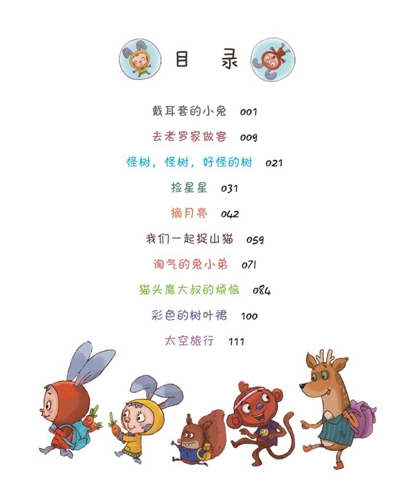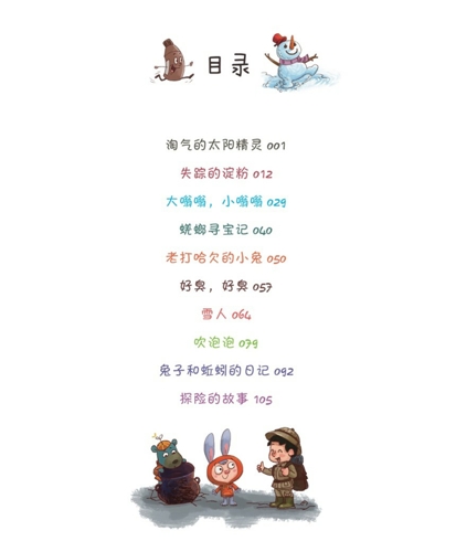 在他們之間,發生著各種奇妙的、有趣的、常常出乎意料的故事。有的令人忍俊不禁,如《水怪嗶阿噗》;有的讓人虛驚一場,如《長鼻怪和膽小鬼》;有的情感脈脈暖如春日,如《彩色的樹葉裙》;有的則親情雋永,令人回味,如《戴耳套的小兔》。