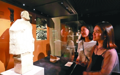 觀眾在清華大學藝術博物館參觀阿富汗國家寶藏展上展出的“赫爾墨斯方形石柱”。新華社發