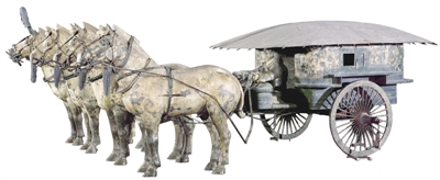 在陵園與兵馬俑坑之間,還分布著近百座馬廄坑,分俑坑、馬坑和俑馬同坑三種形式。有真馬也有陶馬,出土陶器上刻有“大廄”“中廄”“宮廄”等廄苑名字,顯示出這是與宮廷有關的養馬機構,這一發現為記載不多的秦代養馬制度的研究,提供了極為珍貴的實物資料。秦史某種程度上就是一部養馬史,養馬事業貫穿了秦人從最初的古國到王國再到強大帝國的全過程。大批良馬的養成,為秦國的不斷發展強大創造了得天獨厚的條件,也是其軍事力量的保證。銅車馬坑出土的兩乘彩繪單轅雙輪青銅車馬,其結構、系駕方法、天子乘輿制度和金屬制造工藝等,是秦代技術發展、禮儀制度的具體表現。