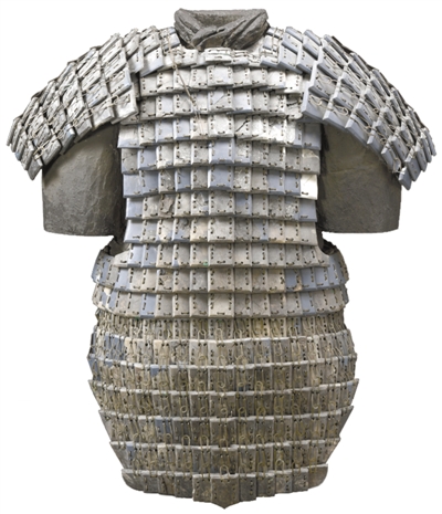 石鎧甲坑,是武庫類的陪葬坑,也是陵園內規模最大的陪葬坑,面積13680平方米,發現大量的石甲、石胄以及石質馬韁構件、青銅工具、青銅車馬器構件等。石質鎧甲和頭盔的出土,顯示了秦人高超的石器加工技術,這些石鎧甲為全手工制作,石片由原始石頭一點點地加工而來,根據不同的使用部位,制作成不同的形狀和弧度,四角鉆孔后,再用青銅絲將其連綴起來。從選材、切割開始,經過琢磨、拋光,最后鉆孔、連綴,模擬考古實驗發現,用現代工藝制作一件鎧甲,一個工匠用時超過一百天。這為進一步認識秦代防護裝具的特點、陵園建設組織施工等提供了豐富的資料。