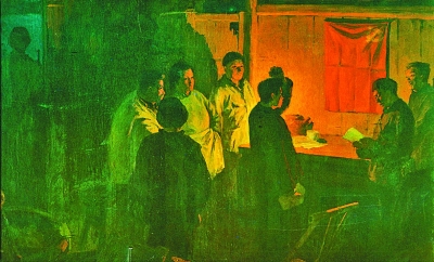 王忻的《永恒的信念——女紅軍》生動刻畫了一名正在油燈前縫制旗幟的女紅軍。人物身后的稻草和房間里堆砌的雜物顯示出戰爭年代生活環境的惡劣。在燈光的映照下,女紅軍面部的表情清晰細膩,專注的眼神閃爍著希望的光芒,傳遞出共產黨員堅定的理想信念。