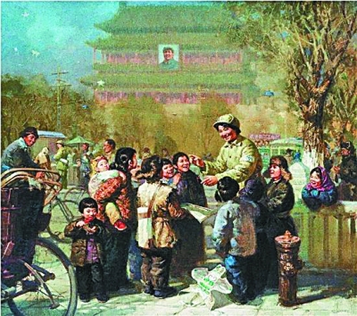 全心全意為人民服務是黨的宗旨?!盀橹袊嗣裰\幸福、為中華民族謀復興”的中國共產黨得到了人民群眾的真心擁護與愛戴,這也是美術家們在創作中樂于表現的主題。張京生、王元珍的《沒有共產黨就沒有新中國》以群像的形式表達了人們對黨的謳歌與熱愛。作品所描繪的情節與內容均出自于作者的親身經歷。在剛剛迎來解放的北京街頭,一群孩子正在跟一位軍管會的女同志學習唱歌。遠處的城樓上懸掛著領袖的畫像,茂密的樹叢沐浴著溫暖的陽光,藍天映襯著飛翔的風箏,營造出歡快與祥和的氣氛。從孩子們極其投入的神情與滿面的笑容里,不難看出他們對新中國的憧憬與希望。