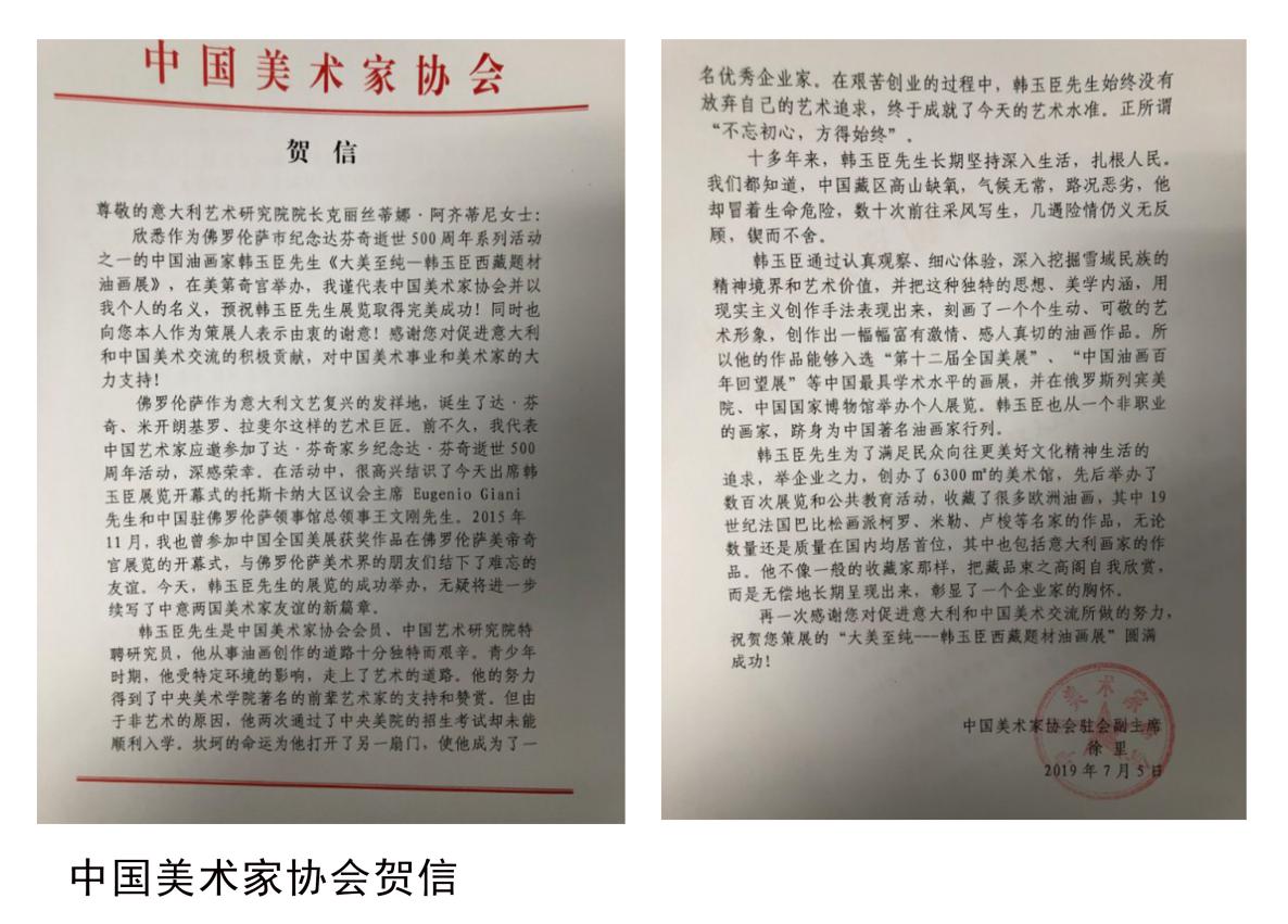 徐里在賀信中說:“佛羅倫薩作為意大利文藝復興的發祥地,誕生了達?芬奇這樣的藝術巨匠。今天,韓玉臣先生的展覽無疑將進一步加深中意美術界之間的友誼。韓玉臣先生是中國美協會員、中國美協油畫藝委會名譽委員,他從事油畫創作的道路十分獨特而艱辛。他對藝術的熱情萌生于青少年期間,但由于非藝術的原因,兩次通過了中央美院的招生考試卻未能順利入學??部赖拿\為他打開了另一扇門,使他成為了一名優秀企業家。在艱苦創業的過程中,韓玉臣先生始終沒有放棄自己的藝術追求,10多年來,堅持深入生活,數十次到藏族地區,遇到過好多次險情,然而他始終鍥而不舍、義無反顧。他通過認真觀察體驗、深入挖掘雪域民族的藝術價值、高原使命,把這種獨特的思想、美學內涵,用現實主義表現形式表現出來。所以他的作品能夠入選“第十二屆全國美展”、“中國油畫百年回望展”等最具學術水平的畫展。韓玉臣從一個非職業的畫家,躋身為中國著名油畫家行列?!?/span>